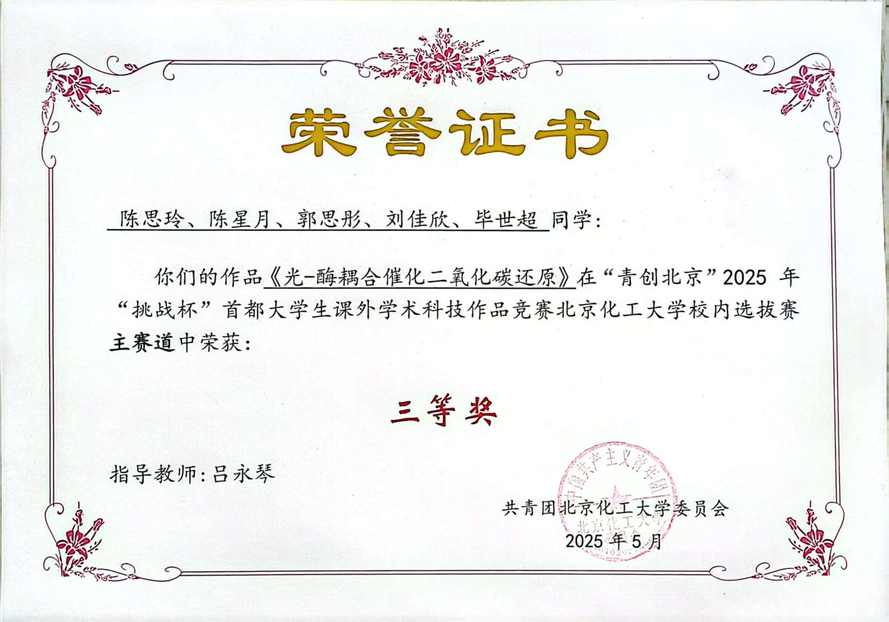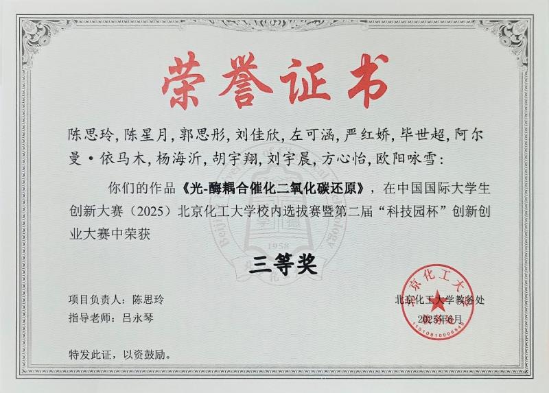 2025年,课题组本科生同学锐意进取,奋勇争先,在多项学科竞赛中斩获佳绩。她们依托课题组的研究平台,将课堂所学与前沿探索相结合,围绕光催化-酶/细菌偶联方向,交出了一份份亮眼的成绩单。截至目前共获得校级奖项5项。